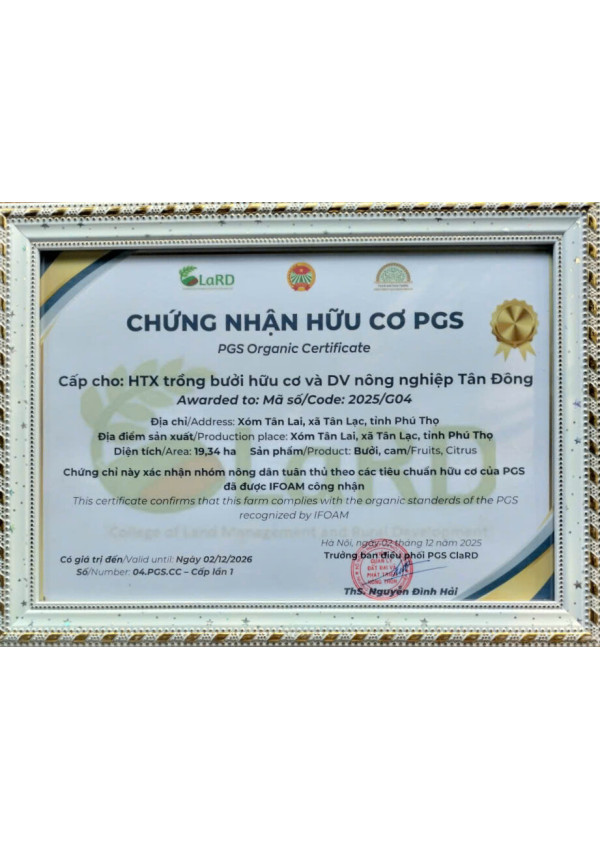 HTX trồng bưởi hữu cơ đc thành lập ngày 15/7/2019 có 25 TV tham gia tổng diện tích là 25ha trong đó có 25 hạ trồng bưởi đỏ tân lạc , trồng theo phương pháp nông nghiệp hữu cơ , còn lại 5ha trồng rừng gỗ lớn,