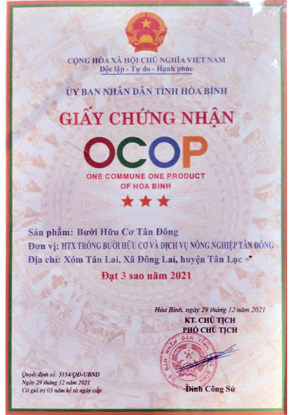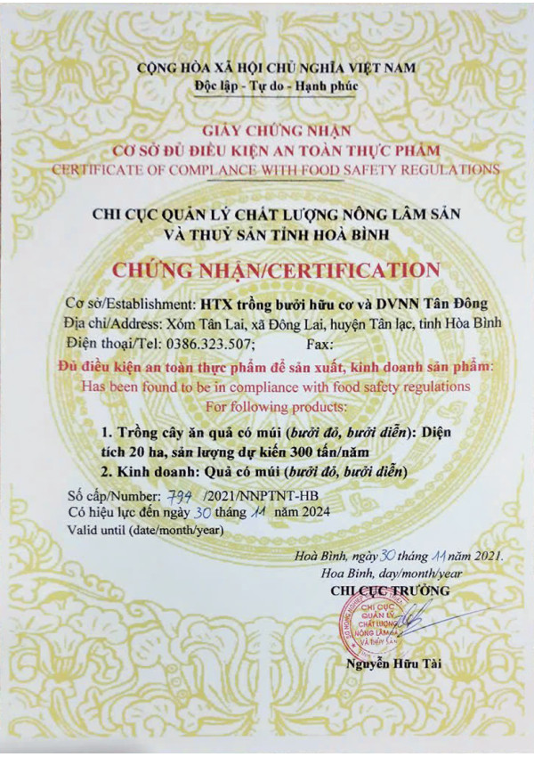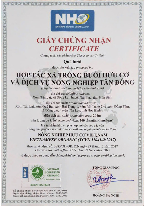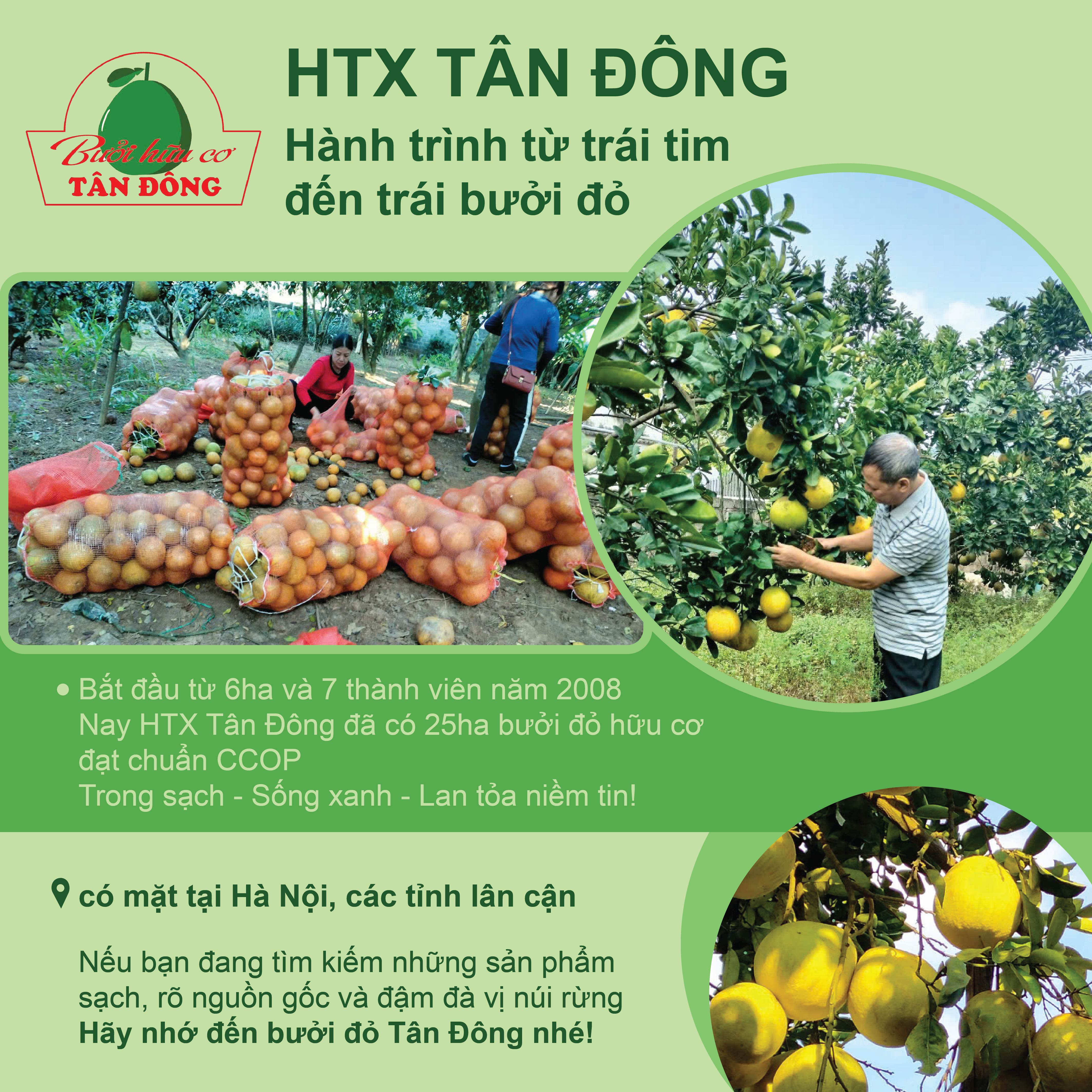 HTX trồng bưởi hữu cơ đc thành lập ngày 15/7/2019 có 25 TV tham gia tổng diện tích là 25ha trong đó có 25 hạ trồng bưởi đỏ tân lạc , trồng theo phương pháp nông nghiệp hữu cơ , còn lại 5ha trồng rừng gỗ lớn,